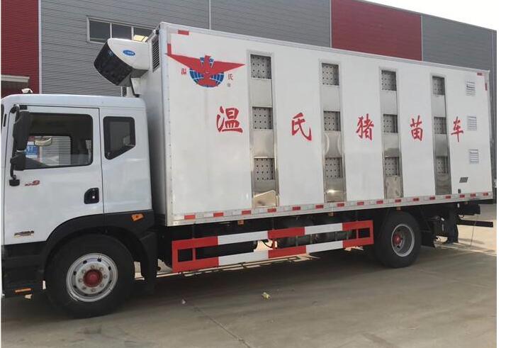 【豬苗車】上裝配置:外玻璃鋼,內(nèi)不銹鋼,兩層液壓升降層板,尾部液壓翻轉(zhuǎn)上豬平臺(tái),層板為不銹鋼骨架鋪鋁花紋板。外部電動(dòng)升降窗,排氣扇,柴油發(fā)電機(jī),暖風(fēng)加熱,喂水系統(tǒng),凈水箱、污水