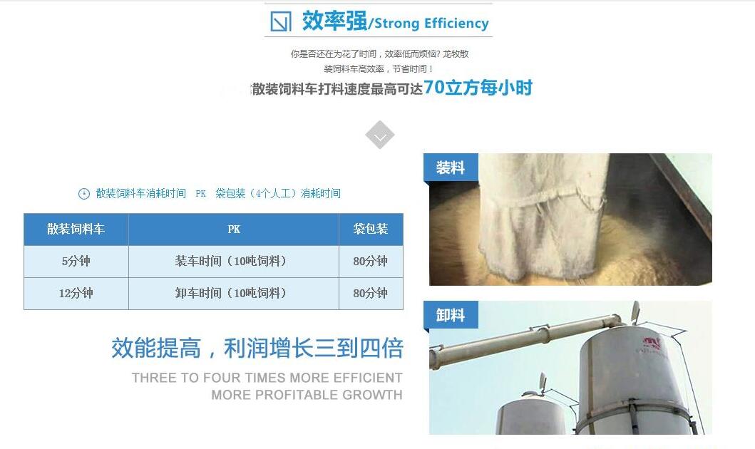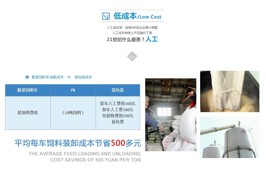 1 經(jīng)濟(jì)效益、勞動(dòng)時(shí)間等對比 項(xiàng)目 袋包裝 飼料罐 裝卸費(fèi)用(1噸飼料) 18元(人工) 2元(電耗) 包裝袋費(fèi)用(1噸飼料) 20元 0元 裝車時(shí)間(10噸飼料) 60分鐘 20分鐘 卸車時(shí)間(10噸飼料) 60分鐘 30分鐘 從上表中可以直觀的看出:1.在裝卸費(fèi)用上,散裝運(yùn)輸比袋包裝運(yùn)輸要節(jié)約16元/噸。2.在包裝費(fèi)用上,散裝運(yùn)輸比袋包裝運(yùn)輸要節(jié)約20元/噸。3.在裝卸時(shí)間上,散裝運(yùn)輸比袋包裝運(yùn)輸要節(jié)約70分鐘。通過以上統(tǒng)計(jì)分析發(fā)現(xiàn),散裝飼料運(yùn)輸車經(jīng)濟(jì)效益非常明顯。